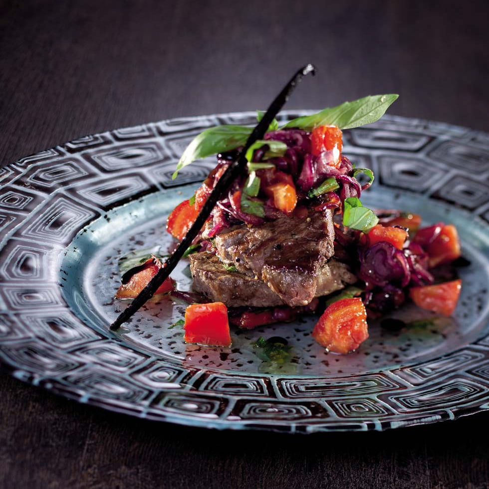 - Красный лук нарежьте соломкой и обжарьте на гриле, добавив оливковое масло, палочку ванили, томаты, листья базилика, соль и перец.