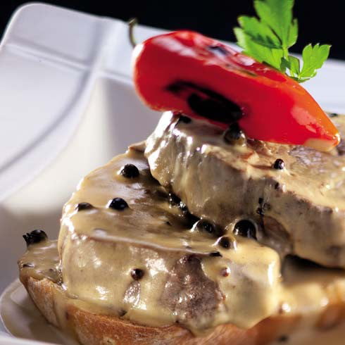 - Приготовьте соус: в сотейнике на сливочном масле обжарьте перец, добавьте коньяк, горчицу и сливки. Тушите смесь до кремообразного состояния.