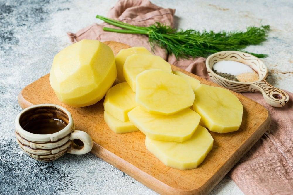 Подготавливаем картошку. Картофель помоем, очистим от кожуры. Порежем овощи кружочками толщиной 5 мм — так они быстро прожарятся на гриле без предварительного отваривания.