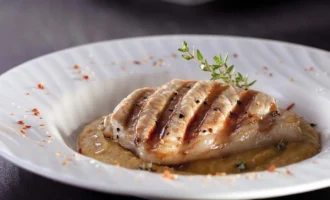- Выкладываем промариновавшуюся куриную грудку на предварительно разогретый гриль и жарим около 5 минут (до образования румяной корочки).