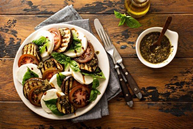 Приготовьте две порции салата «Капрезе». Для этого нарежьте баклажан кружочками и обжарьте его на электрогриле. Также нарежьте кружочками два помидора и моцареллу. Добавьте в салат целые листики зелёного базилика.