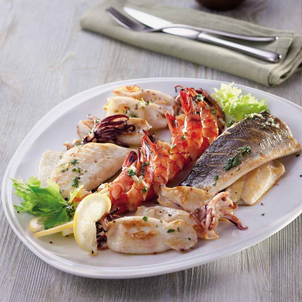 - На гриле поджарьте поочередно морепродукты: филе камбалы и сибаса, креветки и мини-кальмары.