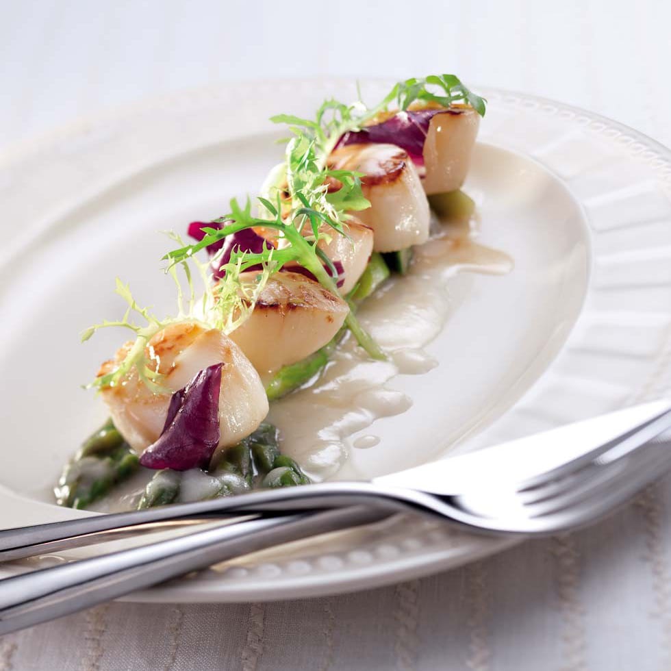 - Спаржу с соусом положите на тарелку, сверху — гребешки.