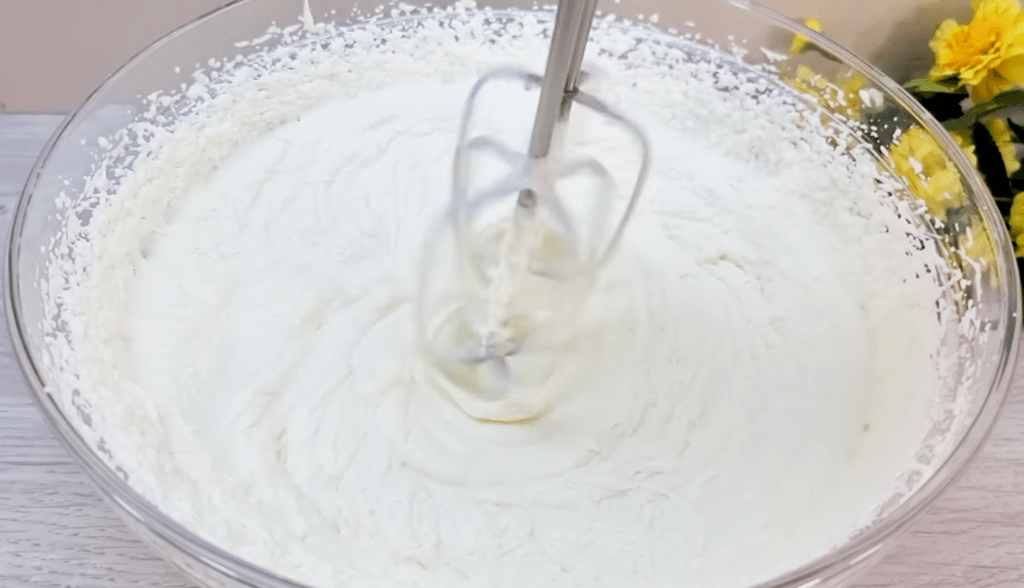 Приготовьте крем. В чашу вылейте сливки (не менее 33% процентов). Добавьте сахарную пудру и сливочный сыр. Взбейте все миксером, чтобы масса увеличилась в объеме и стала пышной.
