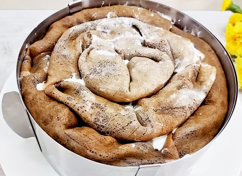 Полученные блинные рулетики укладывайте поочередно по кругу в форму. Концы блинов старайтесь завернуть при этом внутрь. Итак, первый слой уложили, утрамбовали смажьте этот слой кремом. Теперь выложите второй слой и вновь смажьте кремом. Так наполните всю форму блинными рулетиками. Сверху накройте двумя отложенными блинами. Их края аккуратно загните внутрь. Накройте блинный торт пищевой пленкой и уберите в холодильник на ночь.