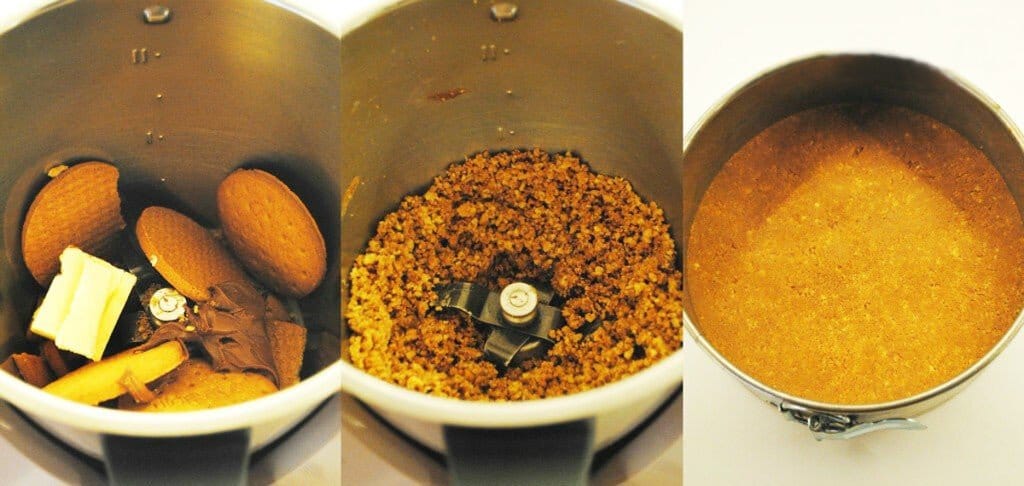Основа торта состоит из 50 г Нутеллы, поэтому первое, что нам нужно сделать, это отделить это количество от общего количества 300 г Нутеллы. Остальное оставляем для начинки. В кухонном комбайне измельчаем печенье, сливочное масло и 50 г Нутеллы. У нас получится однородная масса, которой нужно покрыть дно формы диаметром 18 см (лучше брать форму со съемными бортиками).