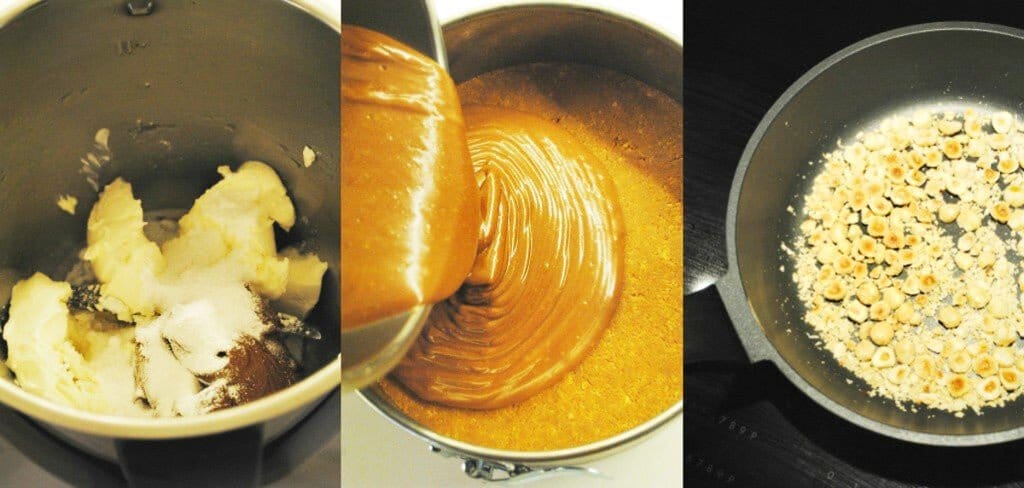 Фундук измельчаем ножом или толчем в ступке и поджариваем на сковороде на среднем огне время от времени помешивая, чтобы не пригорел.