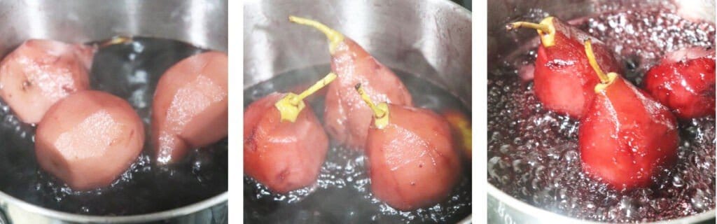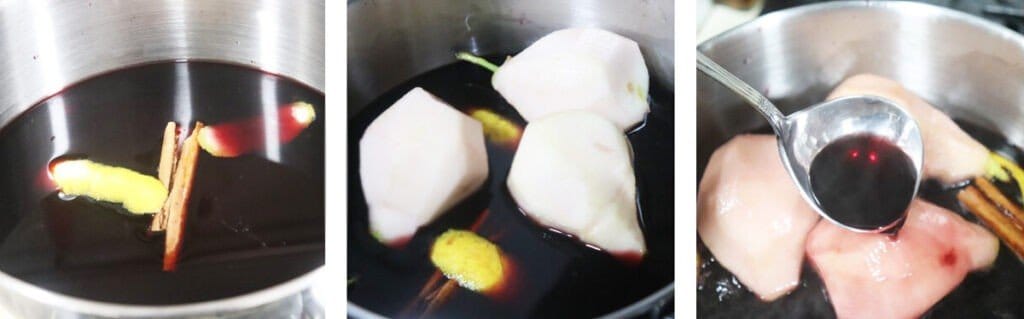 В кастрюлю наливаем вино, добавляем цедру лимона, сахар и корицу. Опускаем в кастрюльку груши и нагреваем все на огне . Время от времени переворачиваем груши и также поливаем их жидкостью. Постепенно они приготовятся и при этом приобретут красивый цвет.
