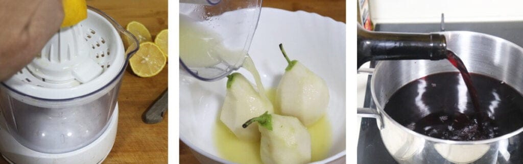 Срезаем цедру лимона и выжимаем сок, откладываем в сторону. Груши очищаем и сбрызгиваем лимонным соком, чтобы они не окислялись. При их очистке отрезаем кусочек основы, чтобы они могли стоять и не падать.