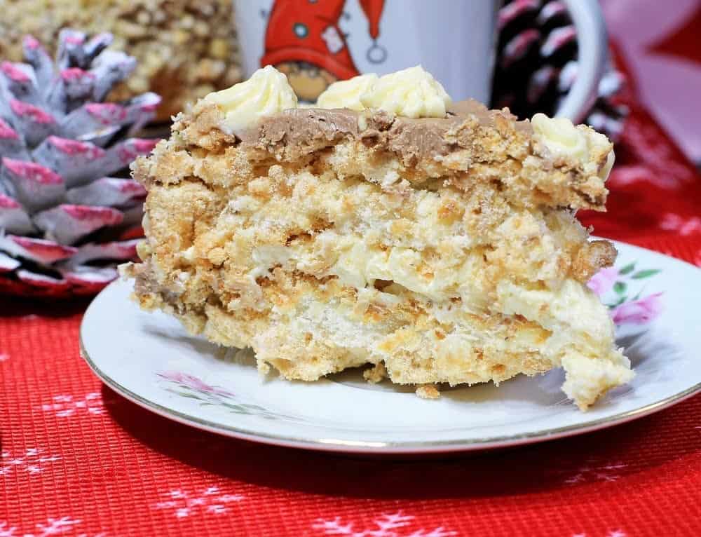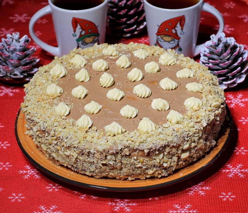 | 7 | Собираем торт. Берем блюдо, кладем первый корж, смазываем его обильно белым кремом, сверху кладем второй корж и немного прижимаем. Бока и верх обмазываем кремом с какао. Края торта посыпаем дроблеными орехами, а из остатков коричневого крема и из отложенного белого крема рисуем украшения на тортик. Даем пропитаться тортику минимум пару часов, для этого убираем его в холодильник. Лучше конечно оставить на ночь. Коржи немного пропитаются, но, тем не менее, все равно останутся хрустящими. Это их отличительная особенность. |