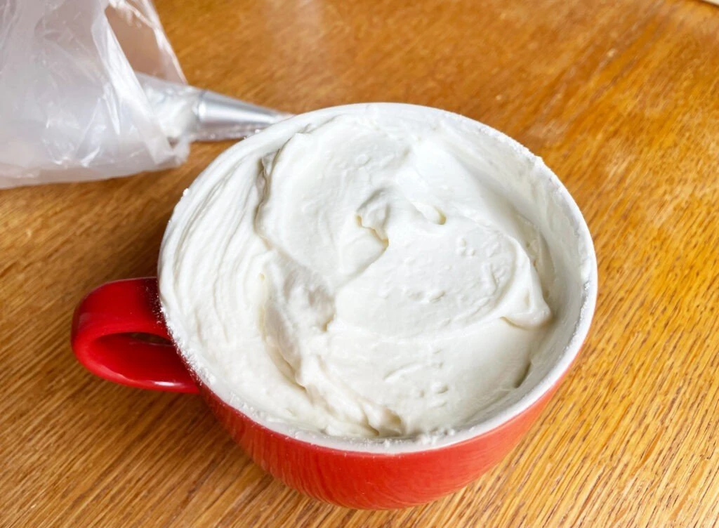4. Переложите крем в кондитерский мешочек. И для большей стабилизации на время уберите крем в холодильник (на несколько часов).
