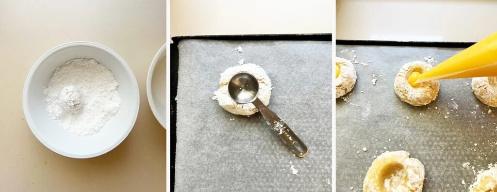 Кончиком пальца делаем в центре каждого шарика выемку, которую заполняем небольшим количеством лимонно-творожного крема. Выпекайте около 10 минут или пока печенье не растечется и не потрескается по краям, а лимонный курд слегка затвердеет.