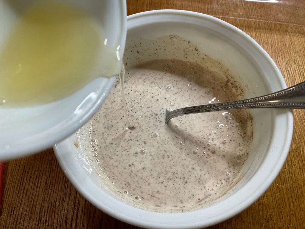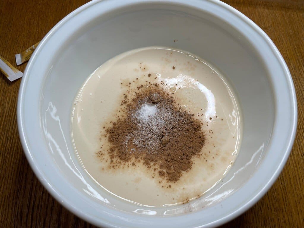 Ряженку выливаем в миску. Всыпаем по вкусу подсластитель (то может мед, сахарозаменитель).Перемешиваем.