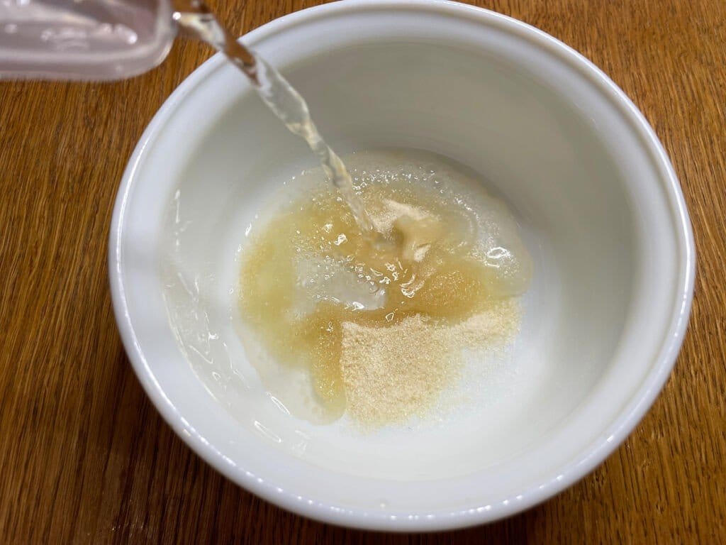 Желатин импульсами (в 15-30 секунд) нагреваем в микроволновой печи, чтобы он полностью растворился (но не кипел).
