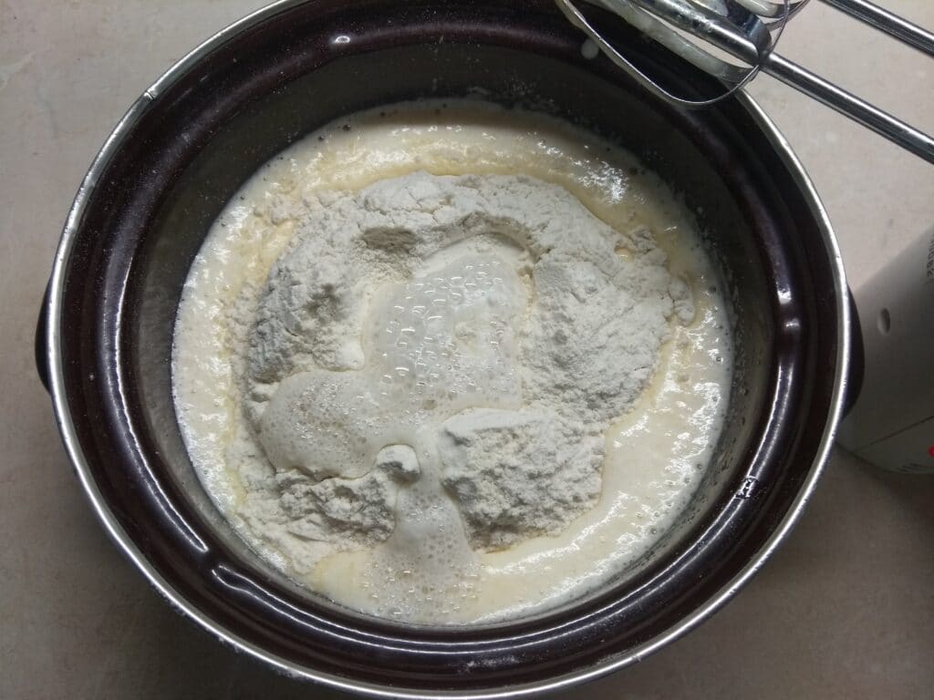 3. Всыпать муку. Погасить соду уксусом. Все тщательно размешать.