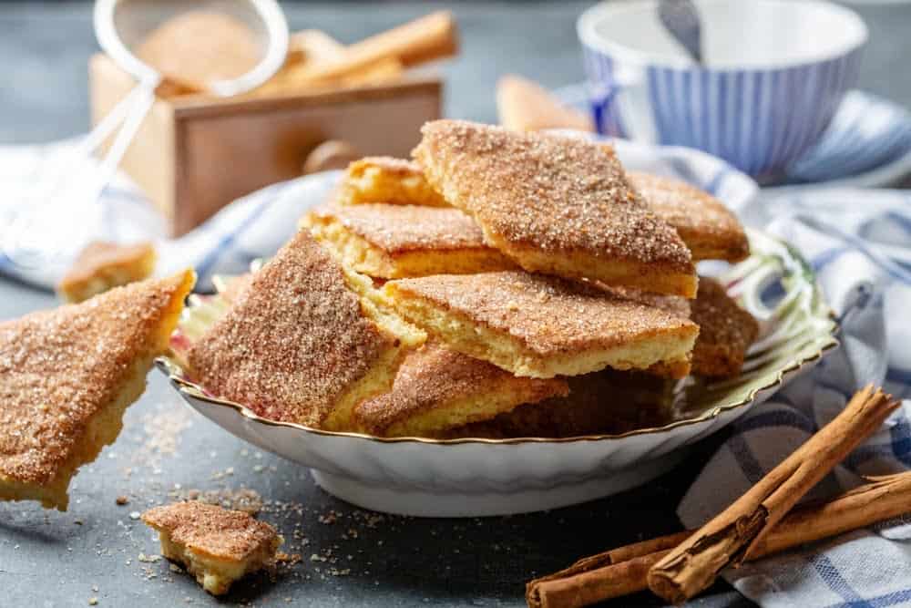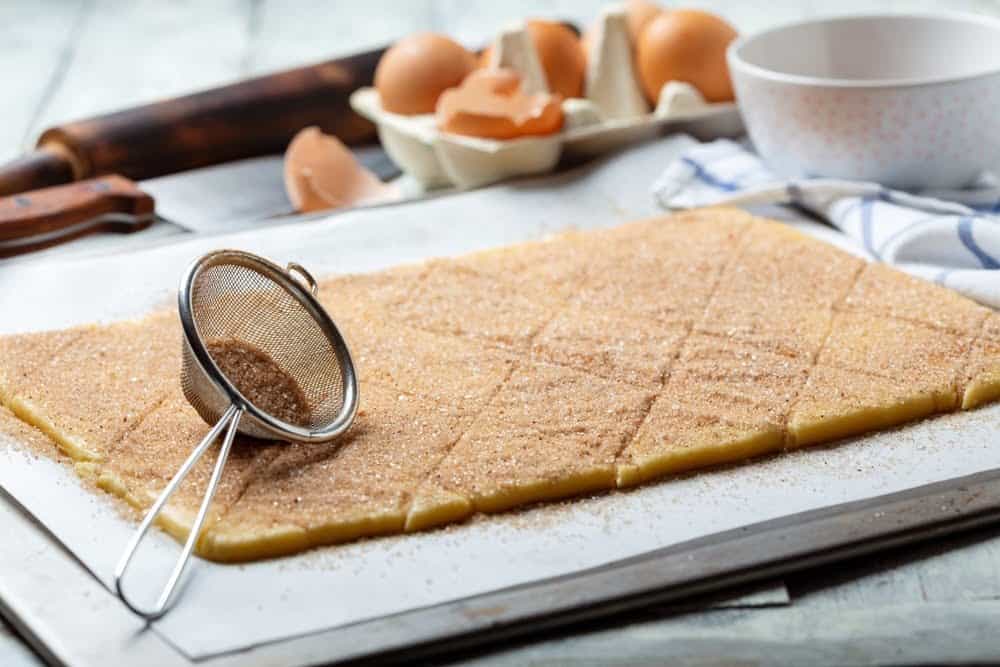 В отдельной чашке смешайте корицу с сахаром. Полученную посыпку равномерно распределите по поверхности теста.