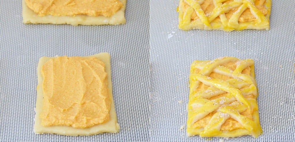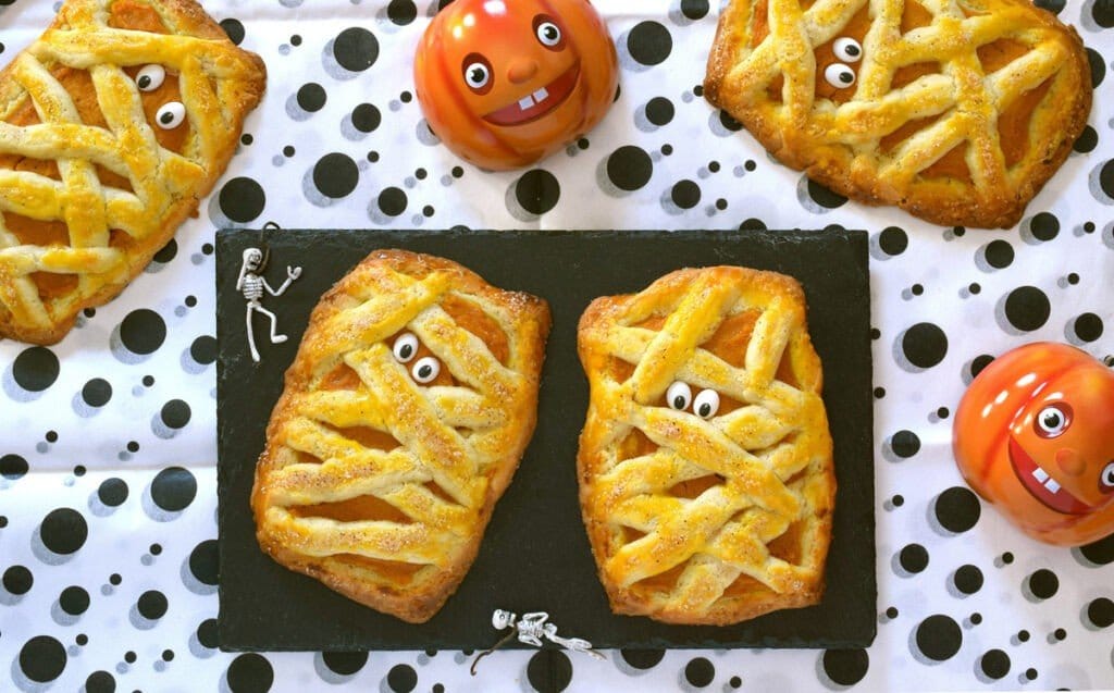 Выложите прямоугольники на противень и смажьте каждый небольшим количеством тыквенного крема, оставляя немного места по краям. Сверху выложите нарезанные полоски теста внахлест, будто это мумия. Края аккуратно прижмите.
