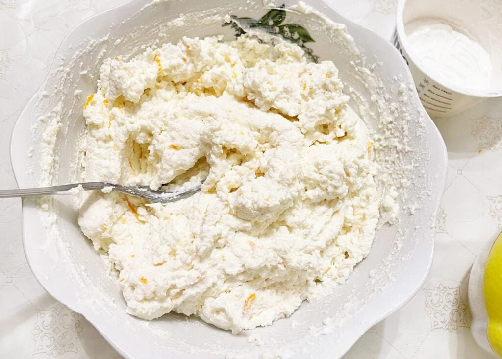 1. Перемешиваем в глубокой чаше творог и греческий йогурт (я использую без добавок), добавив также по вкусу ванилин, заменитель сахара и цедру сочного ароматного апельсина.