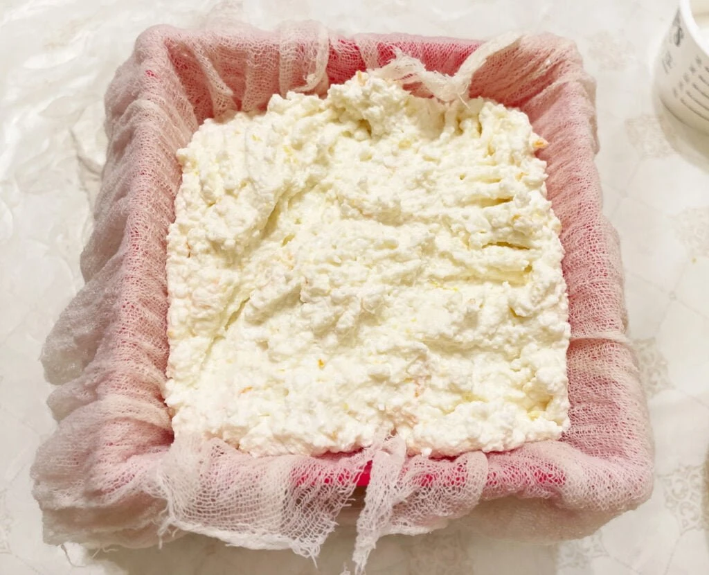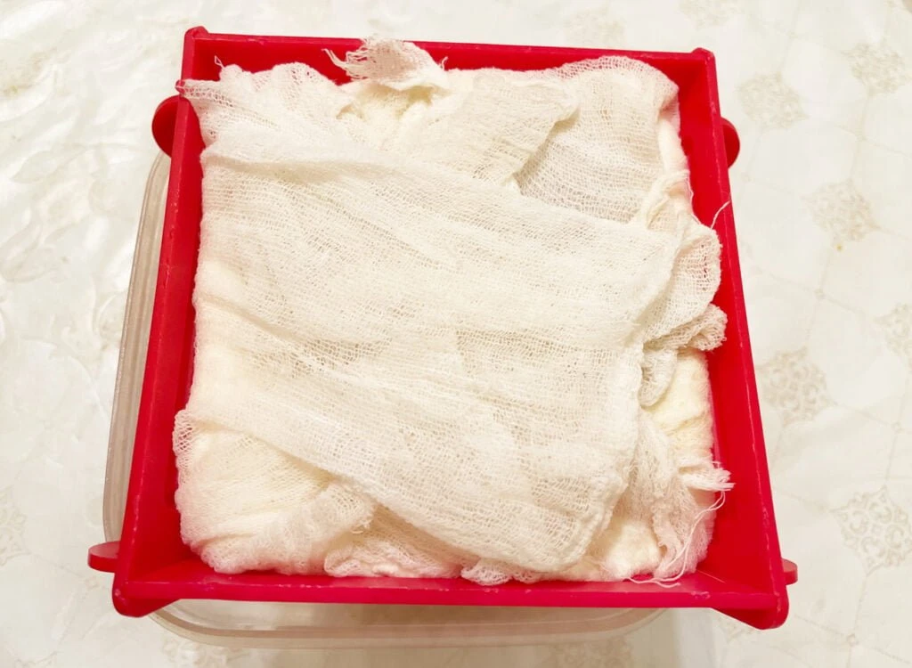 3. Накрываем все оставшимися кусочками марли. Ставим груз в виде тарелки и банки воды (или чего-нибудь подобного, тяжелого). Убираем на ночь в холодильник, поставим при этом пасочницу на тарелку (на случай выделения жидкости).