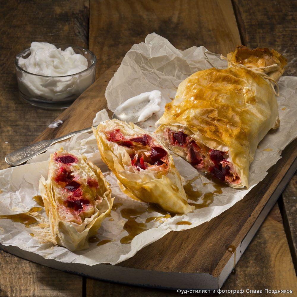 - Разложите лист теста фило, смажьте его сливочным маслом комнатной температуры, сверху положите еще один лист и тоже смажьте его сливочным маслом, положите сверху 3-й лист и не смазывайте его. Вдоль одного края нижним слоем выложите творог, сверху выложите грушу со свёклой. Заверните рулет, края завяжите веревкой для запекания.
