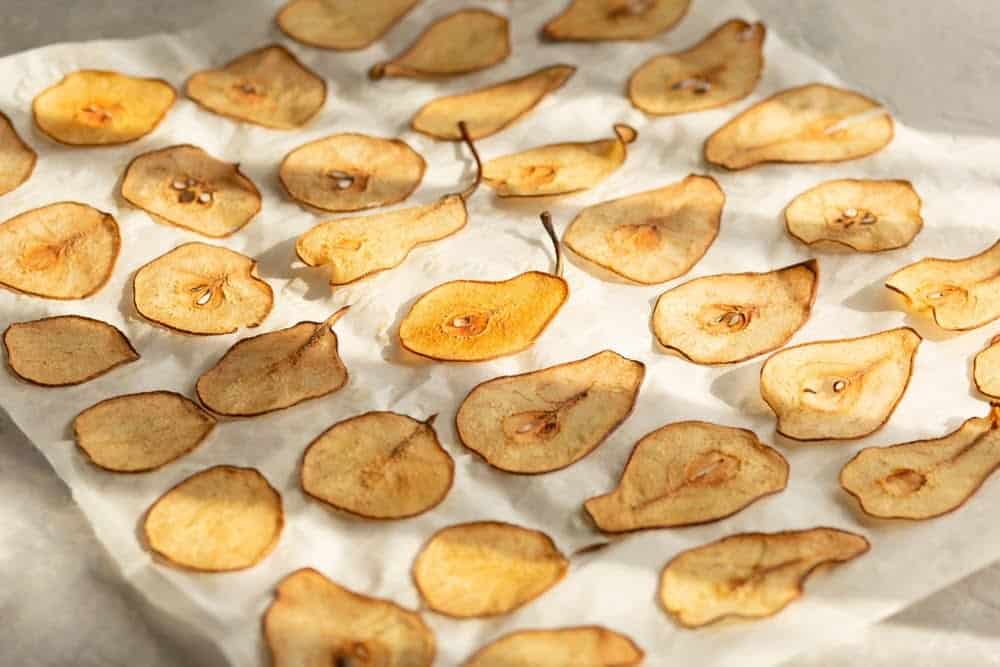 | 3 | Выкладываем пластинки на противень. Ставим в духовку или сушильный шкаф ориентировочно на 5-7 часов, время зависит от толщины груш. Температура в духовке 70 градусов. Процесс приготовления должен проходить в режиме конвенции. В случае отсутствия такого режима, приоткрываем духовку буквально на 1 см. |
