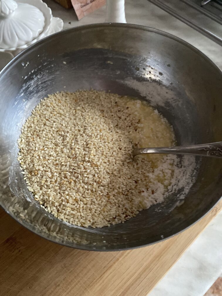 | 6 | ![]() Всыпаем кунжут и замешиваем жидковатое тесто. |