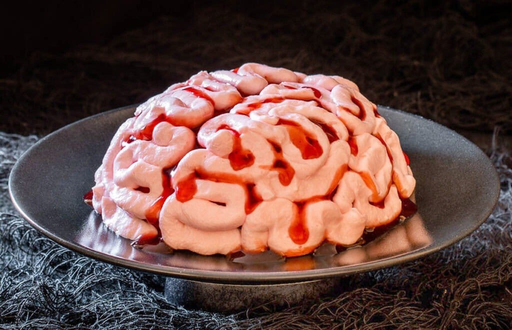 Очень аккуратно украшаем всю поверхность сливочным сыром, придавая характерные формы мозга. В завершение самые большие щели и разделения заполняем густым клубничным сиропом, используя кухонную бутылку или кисточку, чтобы не деформировать украшение.