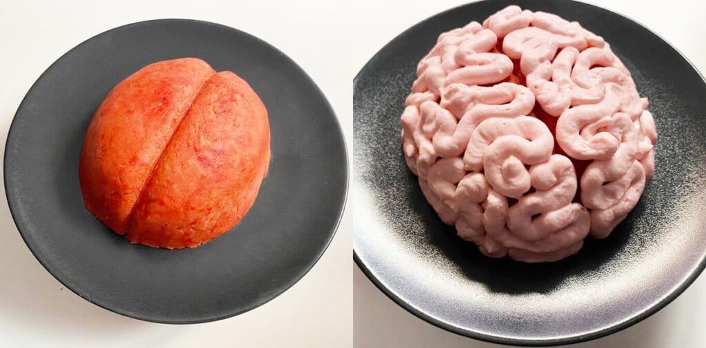 Итак, дорастаем бисквит, убираем пленку, формируем что-то вроде овала. С помощью рук немного сплющиваем основу по бокам, чтобы придать пирогу более реалистичную форму мозга. С помощью шпажки или тупой стороны ножа отмечаем разделение полусфер.
