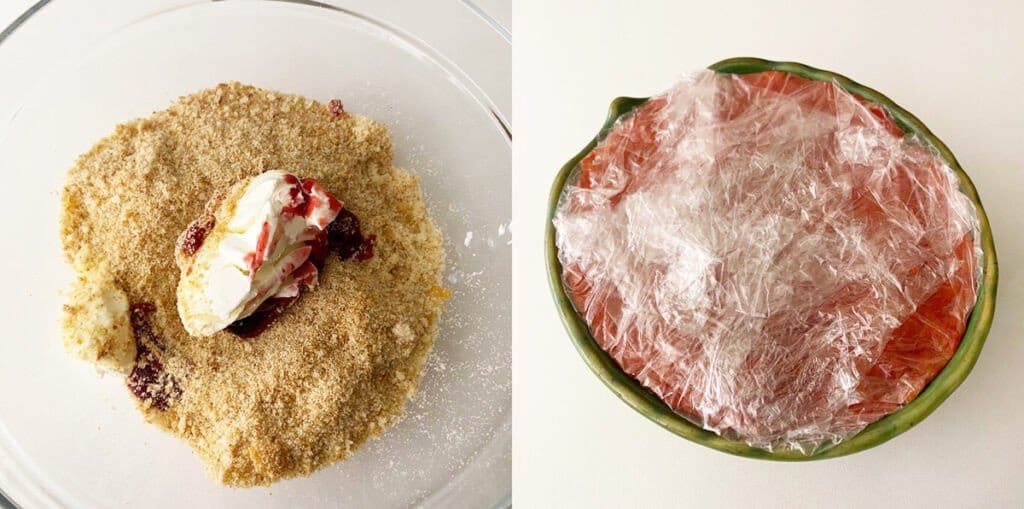 Небольшую миску застилаем полиэтиленовой пленкой. Если у нас будет овальная, еще лучше! Наполняем миску бисквитным тестом, слегка утрамбовываем и убираем в холодильник до востребования.