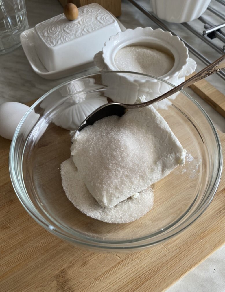 В миску для смешивания продуктов выкладываем творог, добавляем сахар и тщательно перемешиваем до исчезновения комочков.