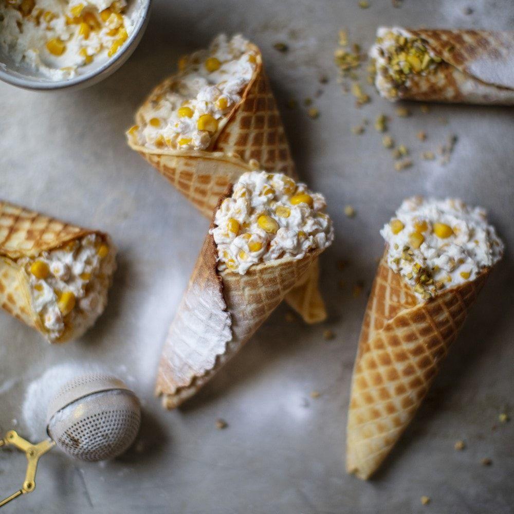 - Приготовьте вафли в вафельнице и придайте им форму рожка. Положите в рожки начинку. Несколько рожков обмакните в фисташки.