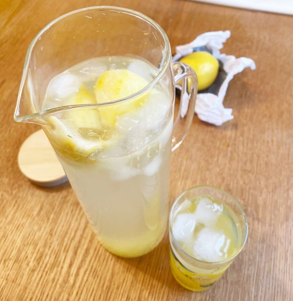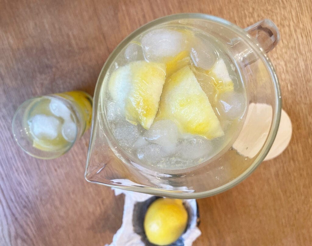 Перелить лимонную заготовку в графин и залить холодной водой. Отжатый лимон нарезать кусочками и забросить в лимонад.
