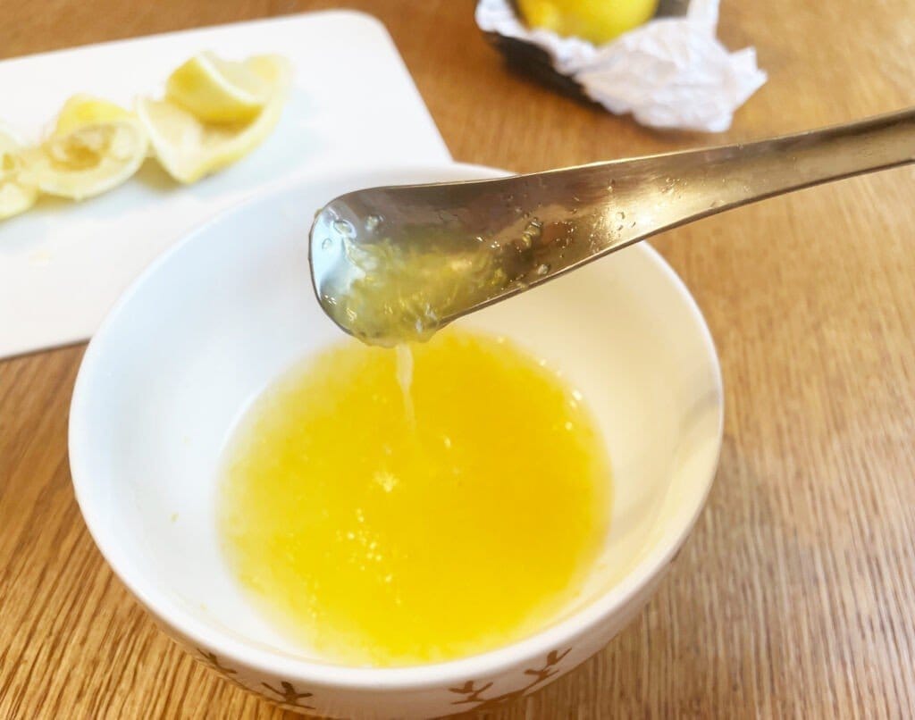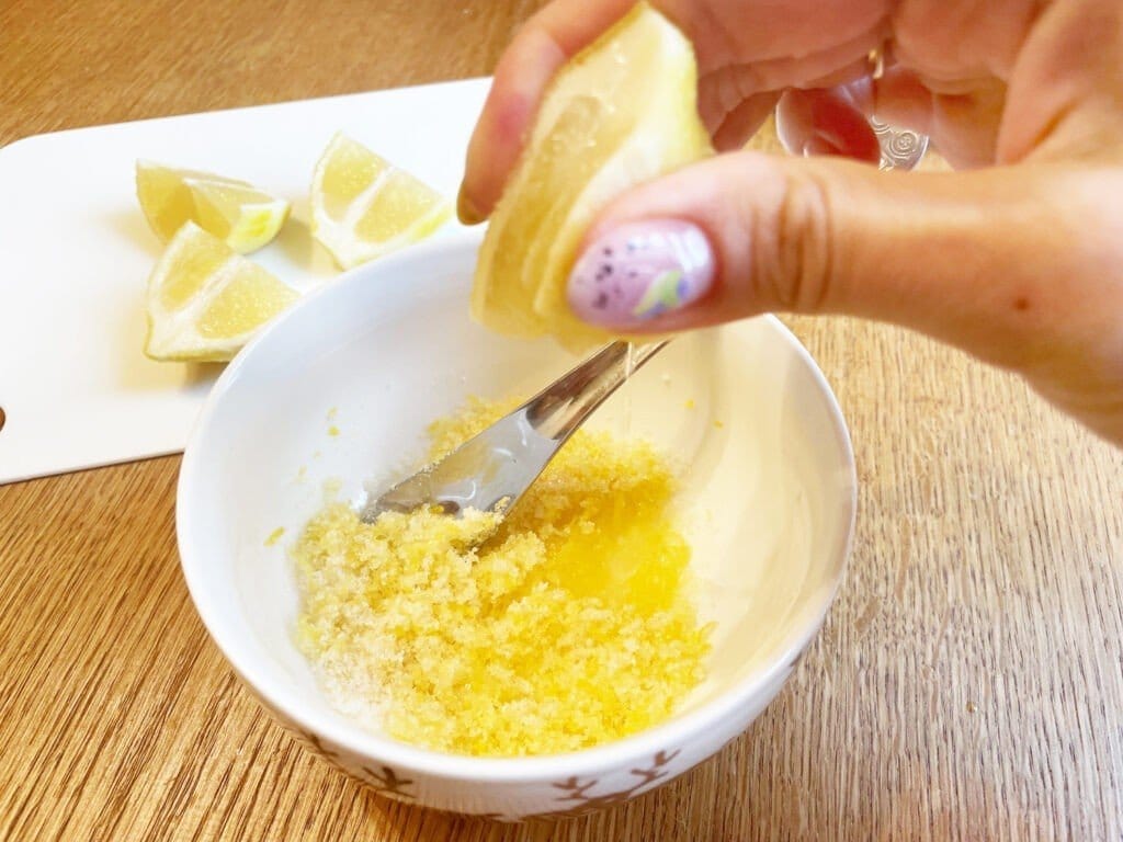 Натереть цедру лимона. Перемешать ее с сахаром и немного перетереть. После выжать сок лимона.