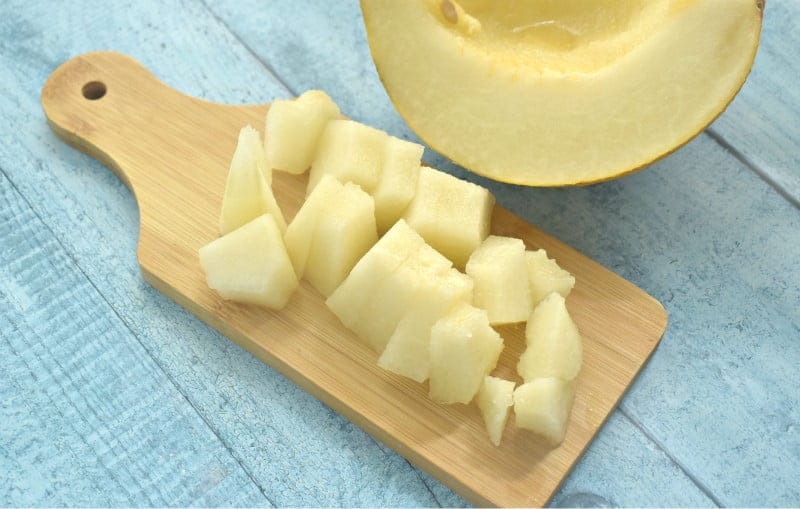 Дыню очищаем, нарезаем небольшими кусочками, которые перекладываем в чашу блендера.