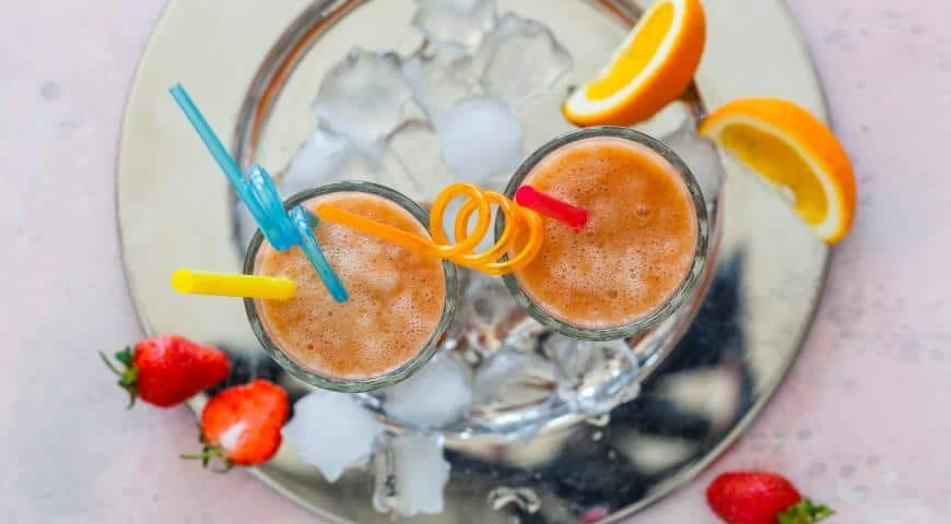 Смузи из банана, апельсинов и клубники — один из многочисленных вариаций этого популярного густого напитка, который завоевал надежные позиции в меню ресторанов и на кулинарных сайтах. Сделать и выпить его можно на завтрак (идеальный вариант!) или… просто когда вам того захочется! Сочетание ингредиентов напитка очень гармоничное, не вызывающее вопросов даже у самых убежденных консерваторов. Банан придает смузи необходимую густоту и бархатистую текстуру, апельсин — приятную кислинку, а клубника — изысканные ноты вкуса и романтический флер. Попробуйте!