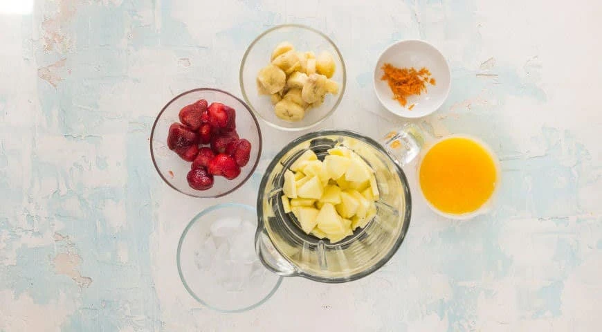 Нарезанное яблоко поместите в чашу блендера. Очистите и нарежьте банан. Натрите цедру апельсина и выдавите сок. Все ингредиенты поместите в чашу блендера к яблоку.