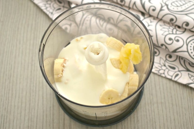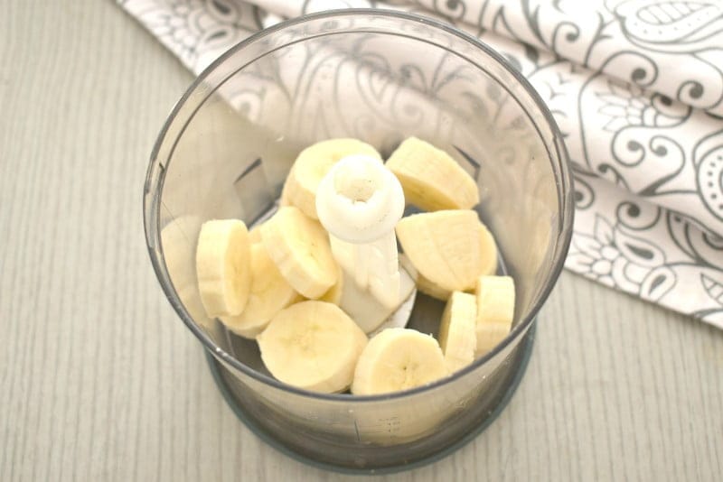 Нарезаем банан небольшими ломтиками и загружаем их в чашу блендера.