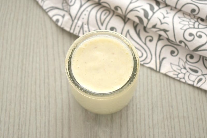 Готовый смузи из кефира, банана и овсяных хлопьев сразу выливаем в стакан и подаём к столу.