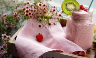 Ингредиенты взбиваем до получения однородной смеси. Если смузи получился на ваш взгляд густым, разбавьте его ещё порцией кефира.