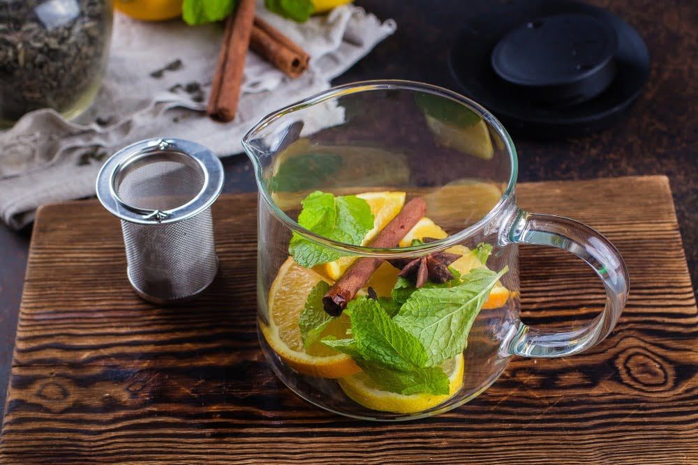 В чайник поместите три чайные ложки зелёного чая (в ситечке). Добавьте в чайник нарезанные фрукты, палочку корицы и мяту.