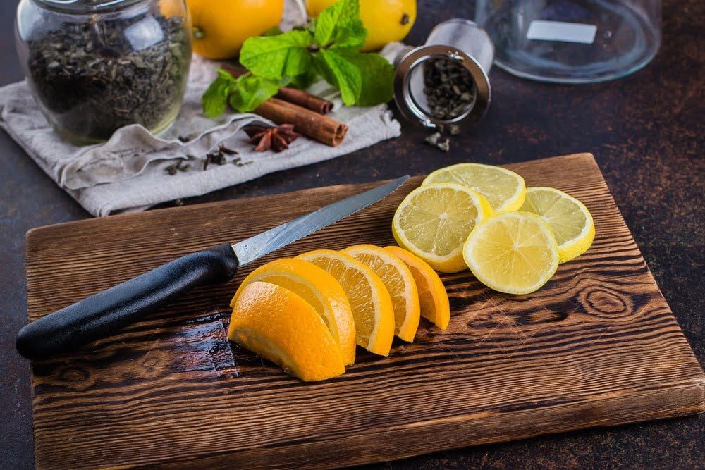 Для начала подготовим фрукты. Помоем апельсин, лимон и мяту. Затем нарежем фрукты дольками.