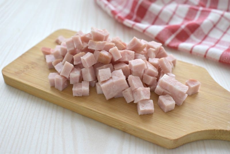 На очереди — ветчина. Измельчаем её соразмерными кубиками.
