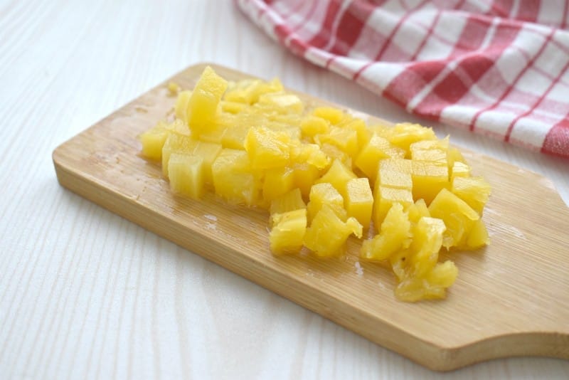 Открываем банку консервированных ананасов. В данном рецепте были использованы кольца ананаса. Нарезаем кольца кубиками, складываем в миску.