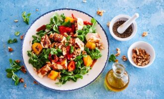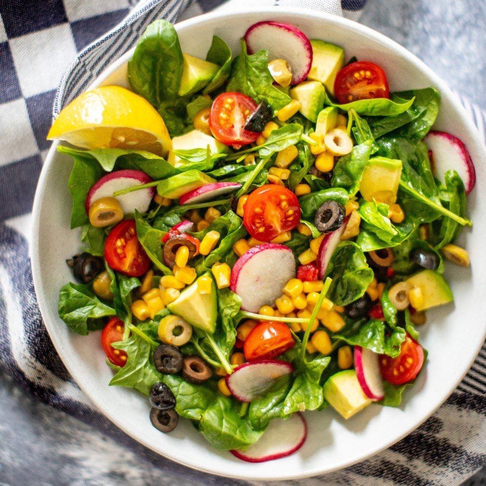 - Заправьте салат лимонной заправкой. Сервируйте, выложив на листья шпината.