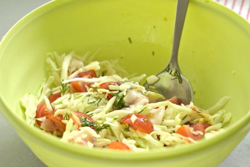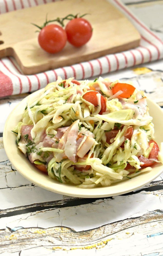 Этот салат получается очень сочным и ароматным благодаря сочетанию белокочанной капусты, свежих помидоров и сырокопчёного бекона. Блюдо отлично подойдет как для обеда, так и для ужина. Давайте попробуем приготовить этот простой и вкусный салат.