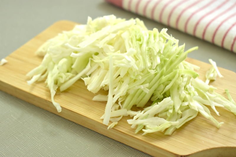 Снимаем в поверхности капусты верхние листы, которые обычно бывают подпорченными. Шинкуем капусту тонкими полосками и складываем в миску. Сразу подсаливаем нарезку из капусты и приминаем руками, чтобы она стала сочнее.