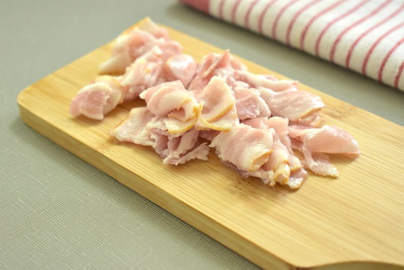 Сырокопченый бекон (тонкие полоски) нарезаем небольшими кусочками и переправляем в миску к капусте.