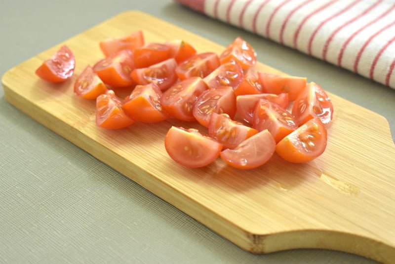 Промываем черри и нарезаем на 2 или 4 части.