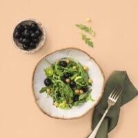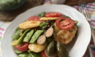 Ингредиенты заправляем оливковым маслом и перемешиваем.