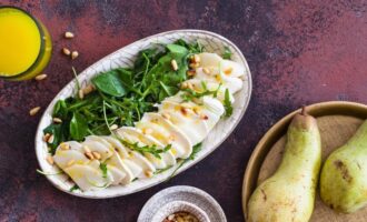 5. Горгонзоллу нарезать пластинками и выложить на салат.